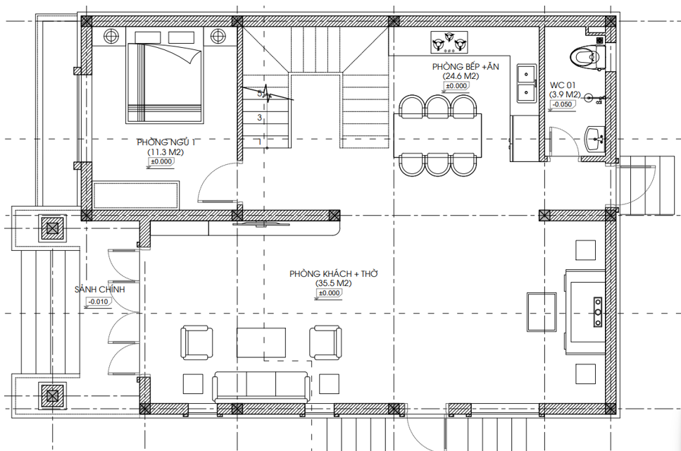 - Không gian phòng khách thờ có diện tích 35.5 m2