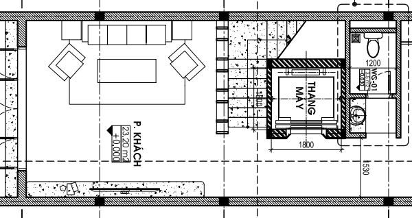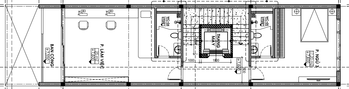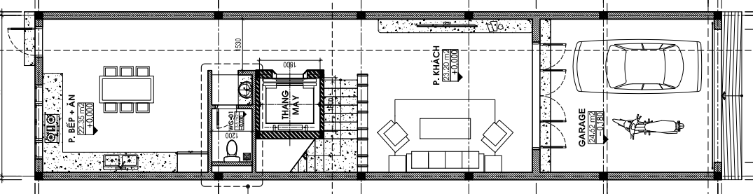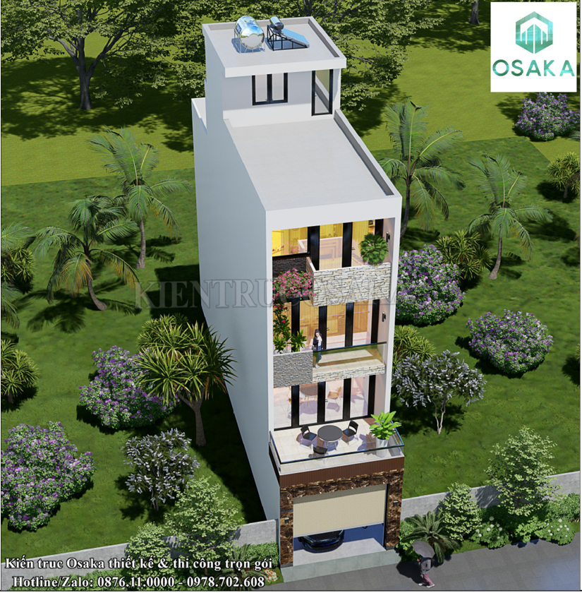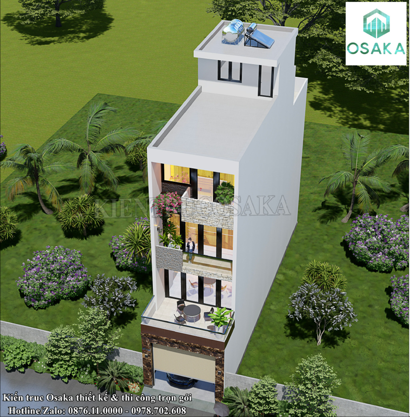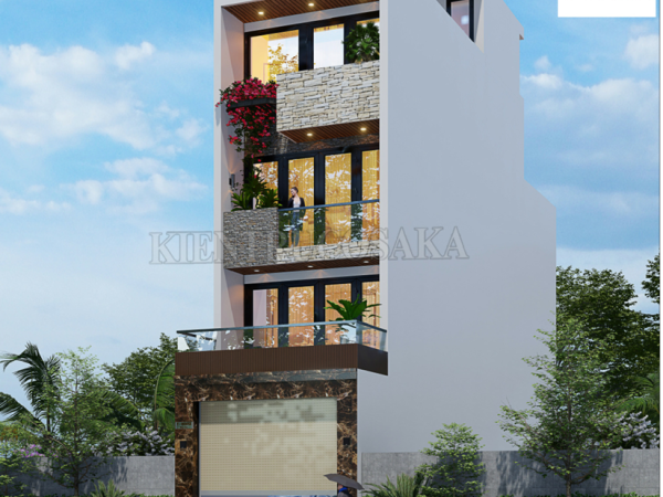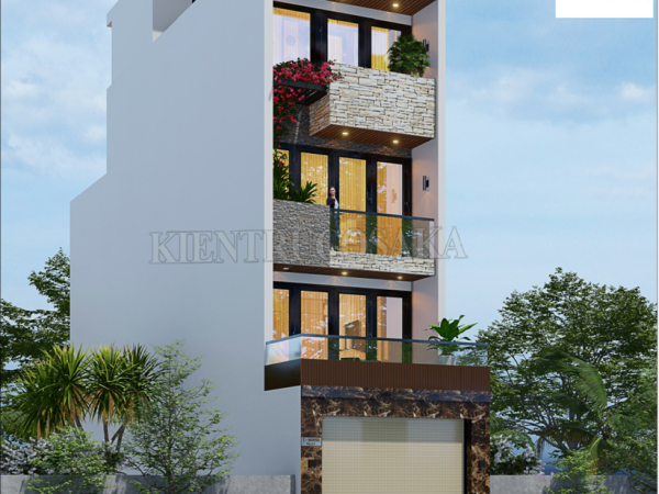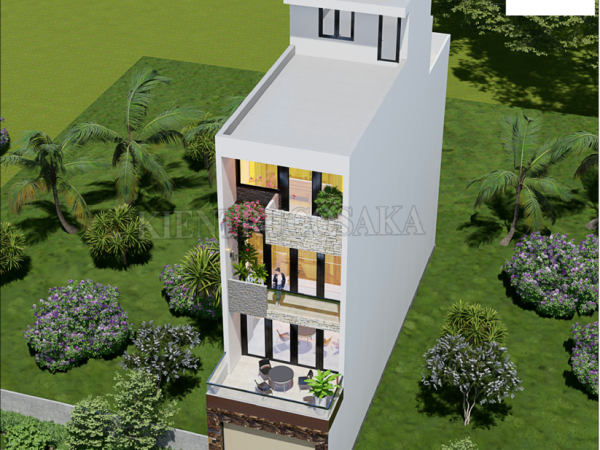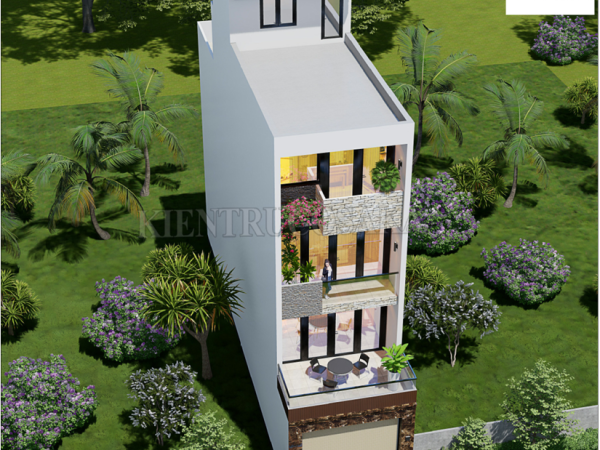 - Phối cảnh tổng thể công trình có chiều rộng mặt tiền : “ 5 m “ và chiều sâu : “ 20 m”