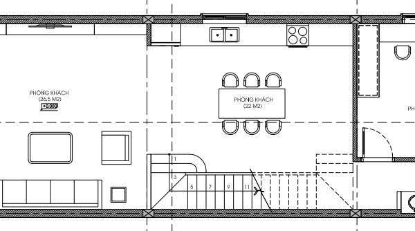 - Phòng bếp cùng phòng ăn có diện tích 22 m2