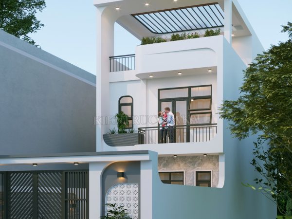 Ngôi nhà sử dụng gam màu trắng chủ đạo, kết hợp hài hòa với màu nâu gỗ và xám đậm, tạo cảm giác sang trọng nhưng vẫn ấm áp. Các mảng đặc – rỗng được xử lý khéo léo, giúp ngôi nhà trông thanh thoát, cao ráo và hiện đại. Không gian xanh được bố trí xen kẽ ở ban công và sân thượng, mang lại sự gần gũi với thiên nhiên.