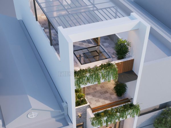 Đặc biệt hơn, thiết kế sử dụng các khoảng thông tầng (giếng trời) và cửa kính lớn để lấy sáng tự nhiên và tạo cảm giác rộng rãi, thoáng đãng, khắc phục nhược điểm diện tích hẹp thường gặp ở nhà phố. Tầng trên cùng có mái che bằng kính cường lực, có thể dùng làm khu vực sinh hoạt chung, thư giãn hoặc vườn thượng uyển, phục vụ cho cuộc sống của gia đình cũng rất ý nghĩa.
