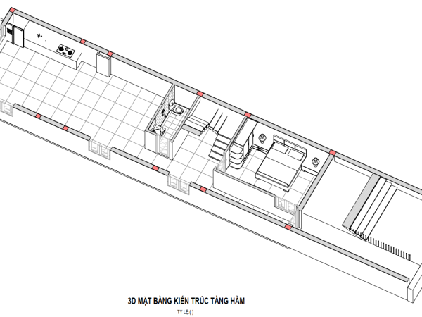 Không gian tầng hầm được bố trí khéo léo làm khu để xe, lùi sâu vào trong giúp mặt tiền phía trên luôn thông thoáng. Lối vào hầm kết hợp bậc tam cấp và khoảng sân nhỏ tạo sự chuyển tiếp nhẹ nhàng, thuận tiện cho sinh hoạt hằng ngày mà vẫn đảm bảo tính riêng tư cho không gian ở.