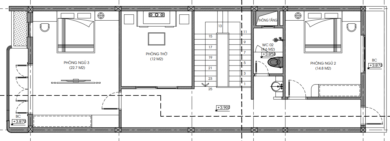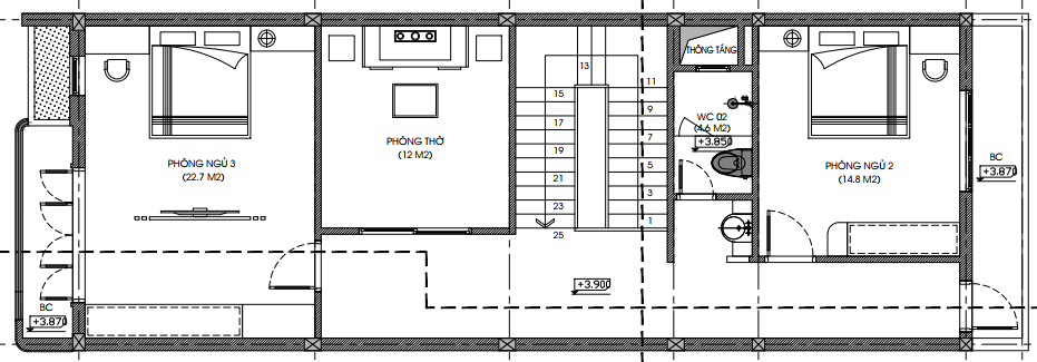 - Phòng ngủ 3 có diện tích 22,7 m2
